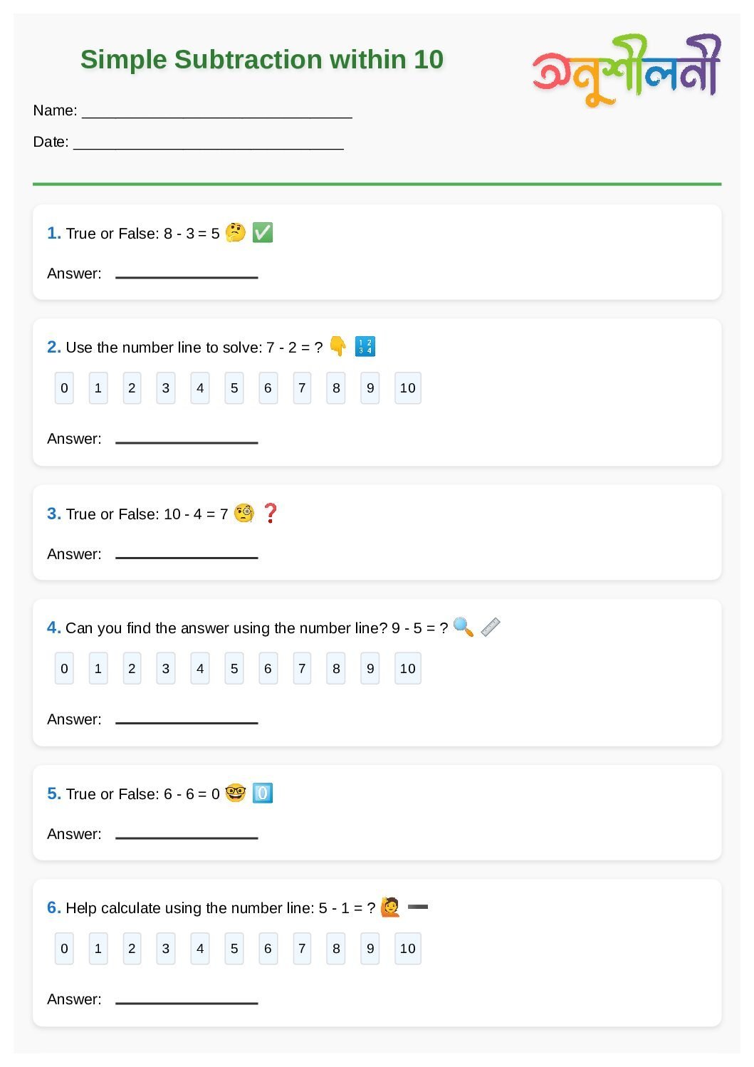 G1-Simple Subtraction within 10-True or False Subtraction-Subtraction Number Line