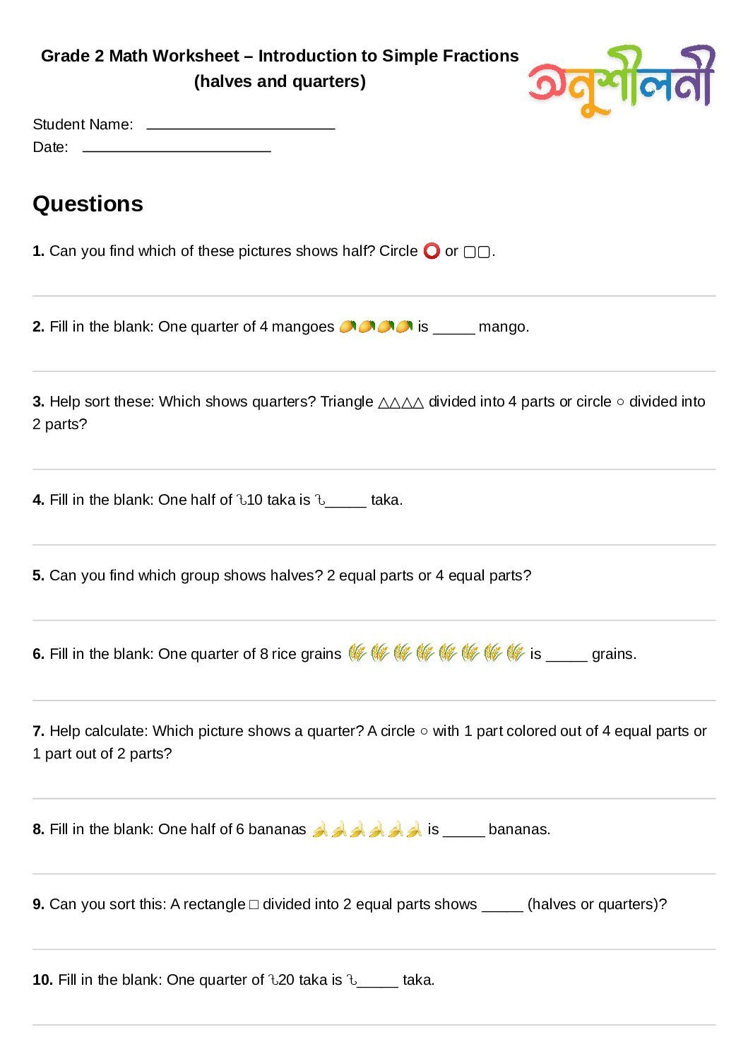 G2-Introduction to Simple Fractions (halves and quarters)-Fraction Name Sort-Fill in the Blank