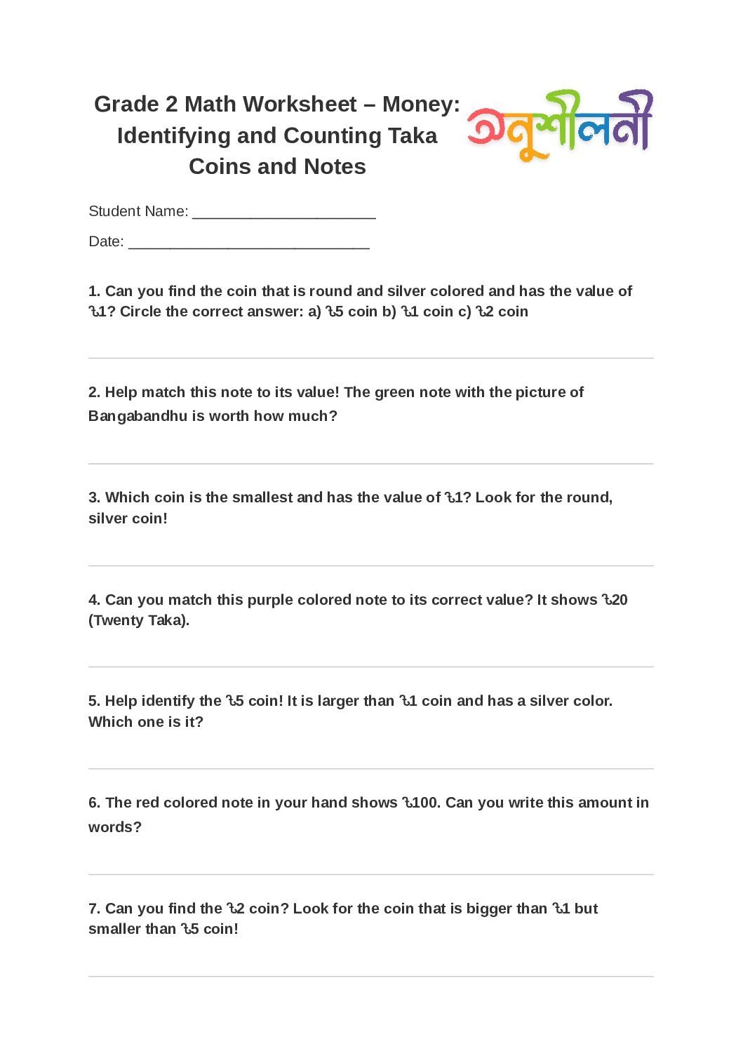 G2-Money: Identifying and Counting Taka Coins and Notes-Coin Identification Game-Note Value Match