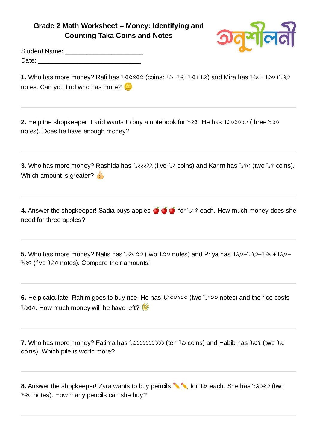 G2-Money: Identifying and Counting Taka Coins and Notes-Who Has More?-Answer the Shopkeeper