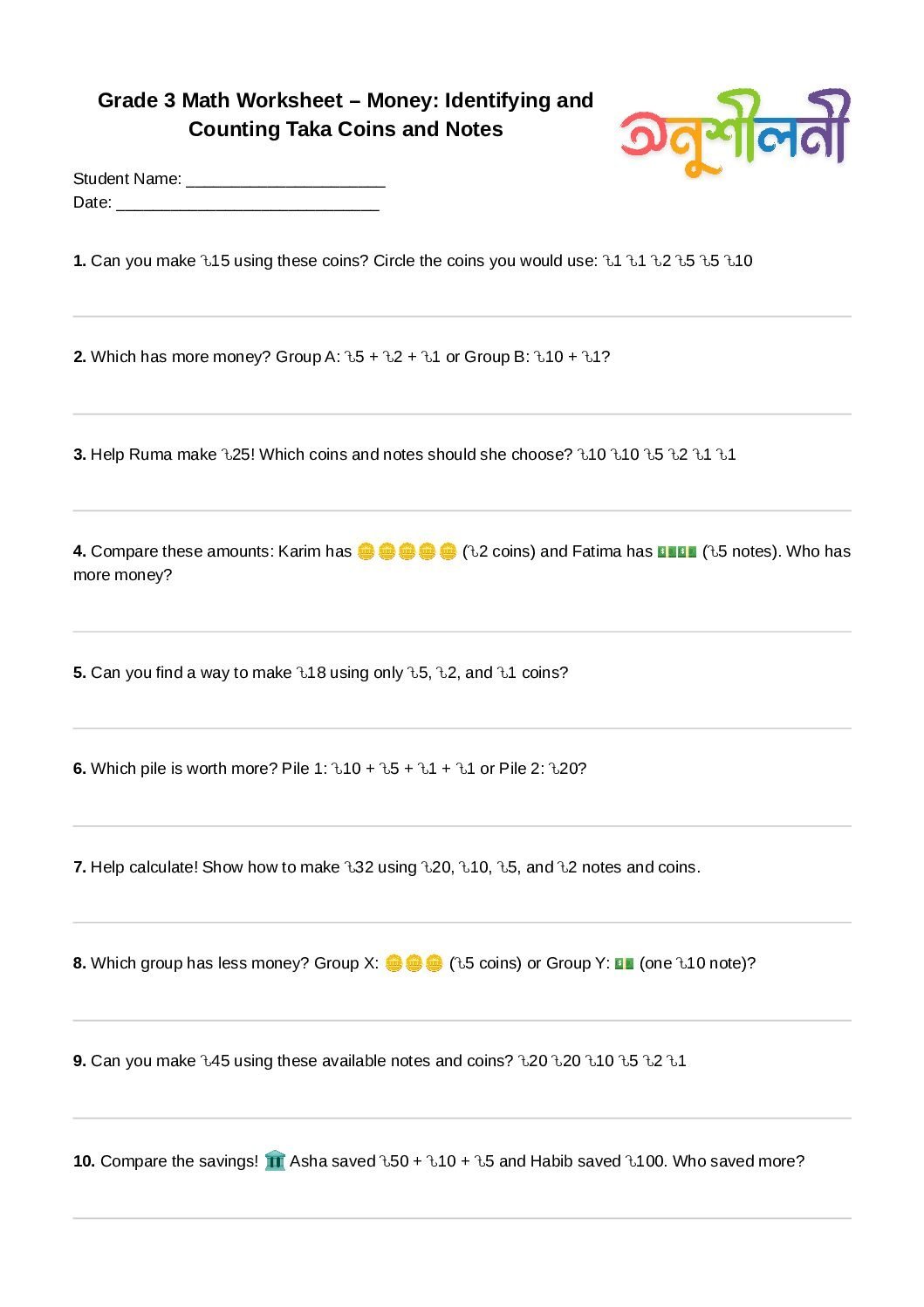 G3-Money: Identifying and Counting Taka Coins and Notes-Make the Amount-Which Is More